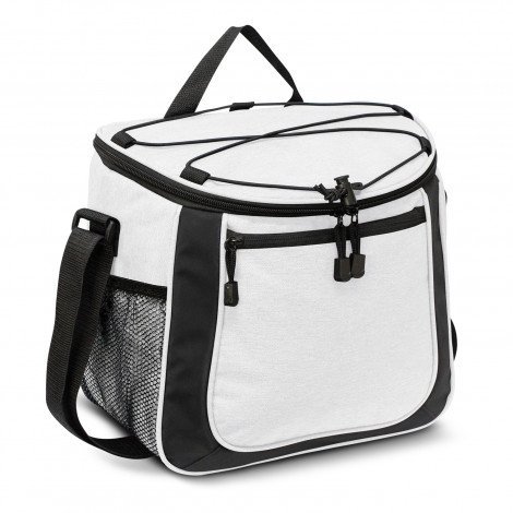 **Features:** Impressive 13L cooler bag with thick PE foam insulation encased in a water-resistant PEVA inner liner. The outer construction is 600D polyester with a large zippered front pocket and two mesh side pockets. Other features include a zippered top closure, smart zipper pulls, a woven carry handle and trendy elastic lacing which is ideal for holding a sweater or light jacket.