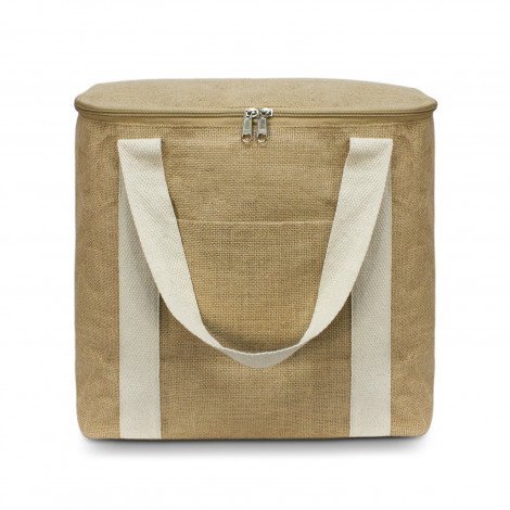 **Features:** Large 19L cooler bag with PE foam insulation encased in a water-resistant PEVA inner liner. The outer construction is an on-trend combination of natural jute partnered with natural cotton carry handles. Other features include a zippered top closure and a jute slip pocket on the front.