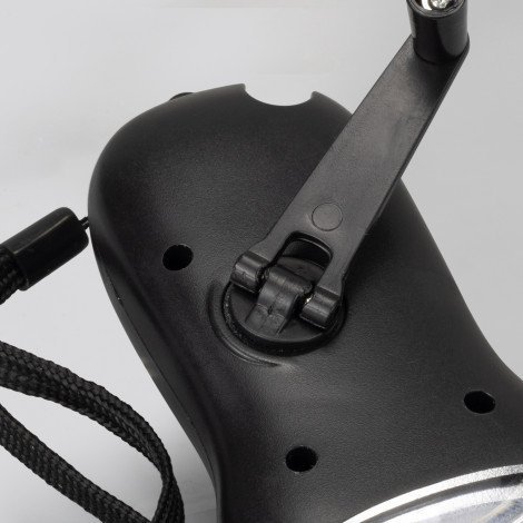* Rechargeable torch with a crank mechanism and solar charging. Matte black with silver trim