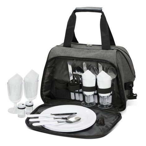 **Features:** Classically designed four person picnic bag which is manufactured from poly-canvas that has an on-trend, heather style fabric finish. It has a large zippered cooler compartment which is lined with thick PE foam insulation encased in a water-resistant PEVA inner liner. The side compartment has a zip around closure that allows it to open out to 90 degrees revealing plates, cutlery, napkins and glasses for four people as well as salt and pepper shakers. Other features include an external zippered pocket, carry handles with a PU/Velcro wrap and a removable shoulder strap which is adjustable and has a comfortable shoulder pad.